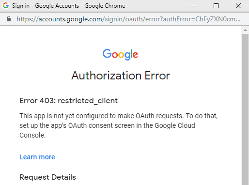 Hi, i am getting 403 restricted client when i try to launch the google sign in web page, it says: google sign in error. This can happen when the wrong google account is used for authorization.
